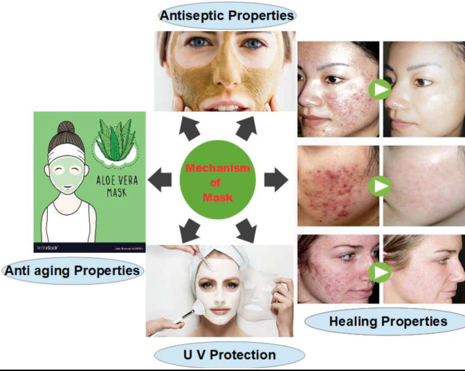In this invention, solution cast technique has been used to create a blend gel of Aloe Vera (AV), MMT (Clay), and PVA (Poly Vinyl Alcohol). XRD, FT-IR, and an ATR spectrophotometer were used to analyses the prepared gel and peeled off membrane. High levels of application, thin-film forming performance, the shortest bare time, and ideal homogeneity of the green-clay particles and aloe vera on or before dehydrating were all given by significant formulation. As a result, the basic stability inquiry that may optimize formulation is stable even under poor storage conditions. The nature of various chemicals and their concentrations for the reactions examined may be determined with the use of useful statistical methods, which also make it possible to identify the best conditions for improving green clay and aloe vera peel-off facemasks.